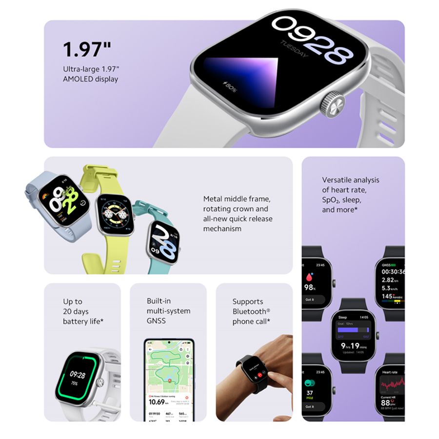 • شاشة AMOLED عالية الدقة مقاس 1.97 بوصة (390 × 450 بكسل) و60 هرتز